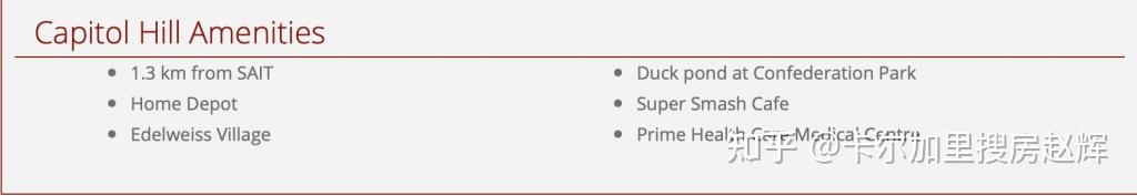 Capitol Hill的边界包括北边的Confederation公园,西边的19街,南边的跨加拿大高速公路,东边的10街。这个社区提供了便利的交通,包括SAIT学院、联邦公园的设施、北山中心的购物和餐饮、公共交通等等。居民可以在Jimmy’s A&A Mediterranean Deli吃午饭,或者在Earl’s Kitchen and Bar吃晚饭。这两个地方都位于Capitol Hill内。其他几家商店和餐馆都位于该社区南部边界的跨加公路附近。