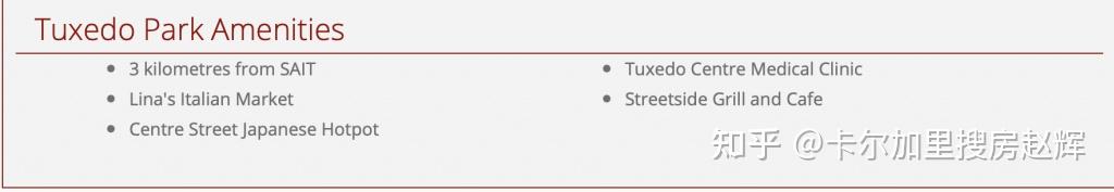 Tuxedo Park于1910年被吞并,是卡尔加里最古老的社区之一。该社区有许多历史悠久的房屋和建筑,较新的房屋,排屋和公寓。Tuxedo Park的待售房屋价格从300多美元到100万美元以下。Tuxedo Park社区协会举办年度活动和其他活动,如加拿大日庆典和啤酒节。该协会还提供社区公园、社区中心和滑冰场。